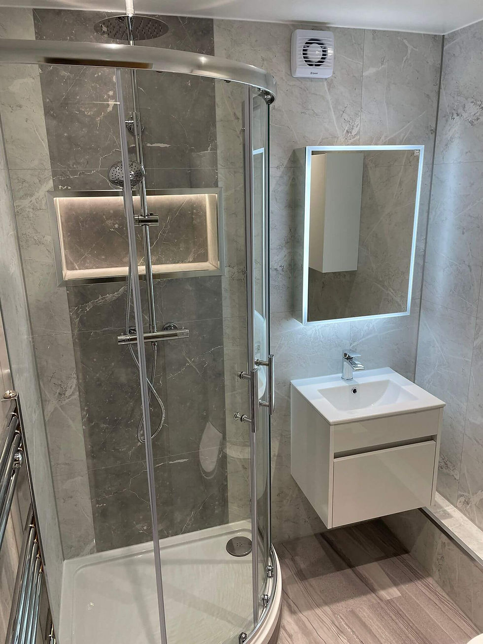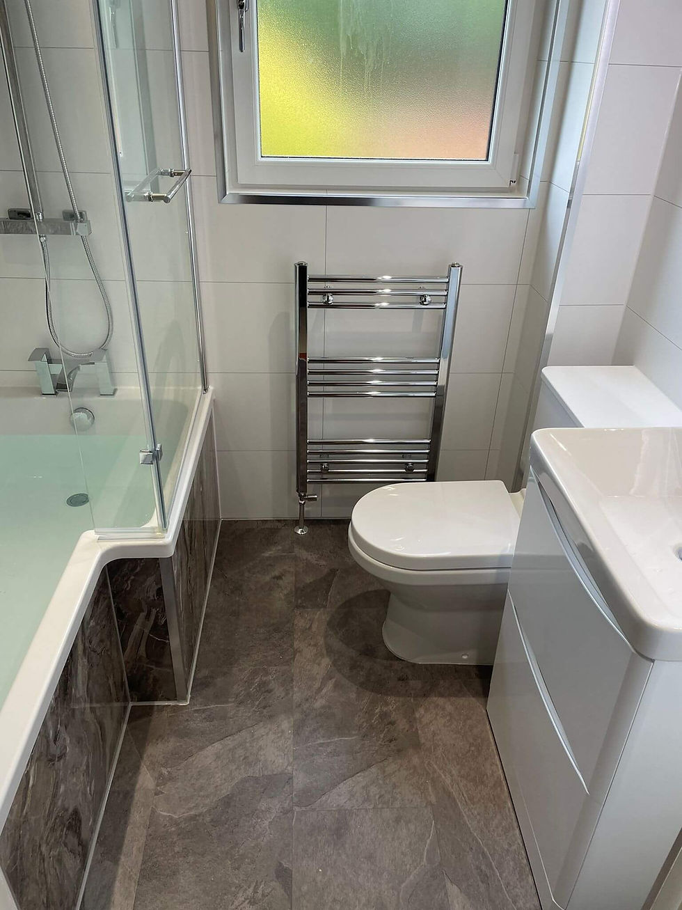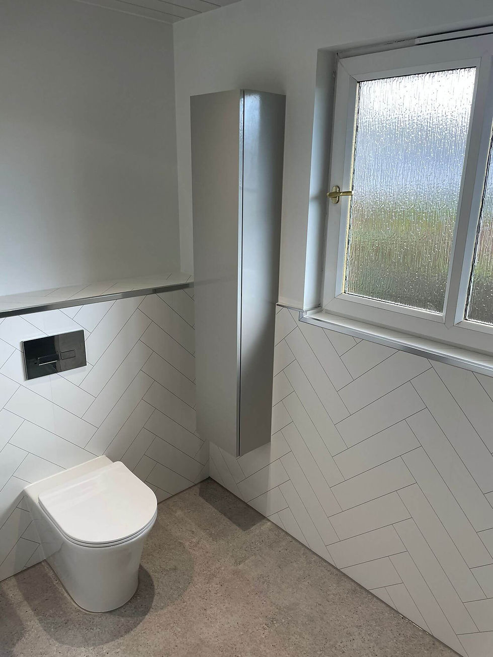 This stylish bathroom features a herringbone tile effect in white and grey, creating a sense of contemporary elegance. The feature wall in grey herringbone also features a full-length alcove shower shelf with hidden LED lights, providing a soft, ambient glow. The wall panels have been installed to half height, allowing the natural light to flood in and create a bright and airy space.