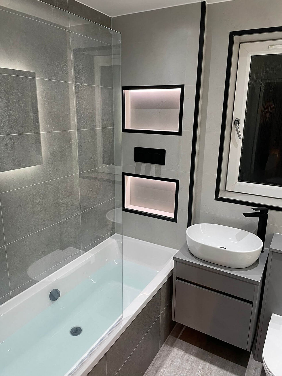 This modern grey bathroom features a concealed valve that controls the bath and rainfall shower, creating a sleek and minimalist look. The floating basin unit with countertop mounted basin adds a touch of lightness and airiness, while the black fixtures provide a touch of sophistication.